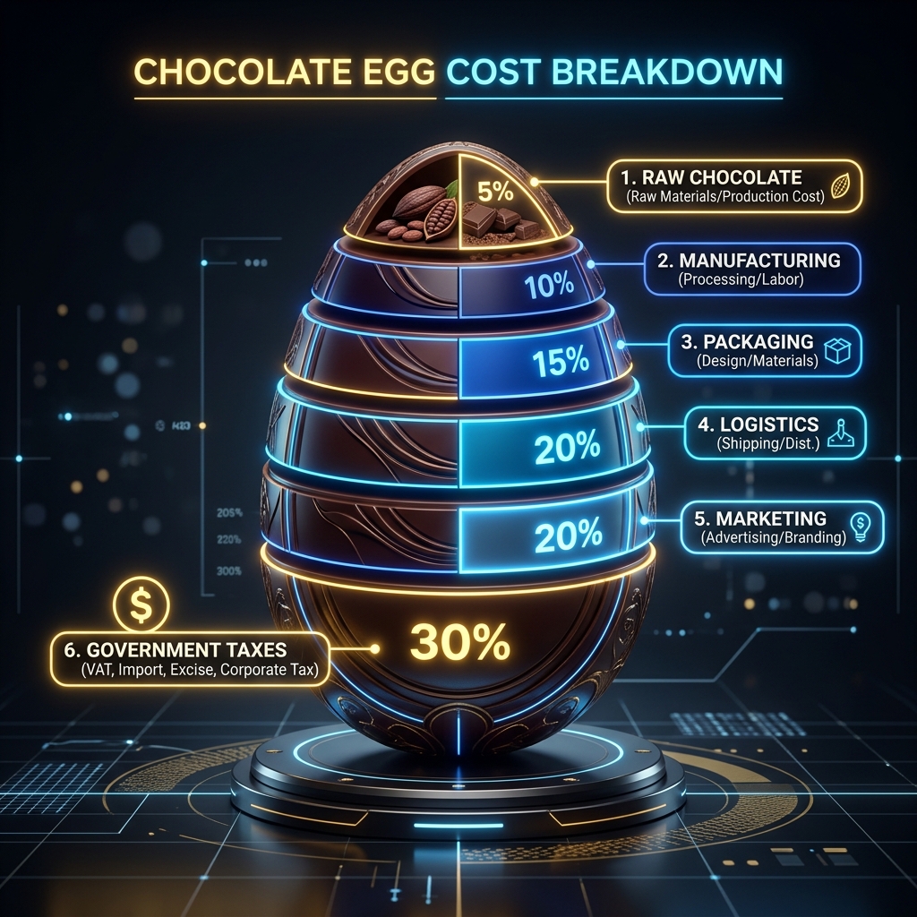 Se desmontarmos um Ovo de Páscoa padrão de R$ 65,65, eis a distribuição oficial dos blocos que devoram seu dinheiro, deixando claro que o chocolate em si é a menor das suas despesas: